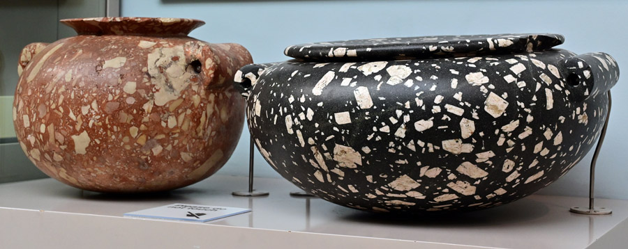 Green Conglomerate: this is a fun, volcanic rock that consists of multi-colored (white, brown, yellow, green, etc) chips (chert, quartz, and quartzite) mixed in green mass. Romans called it ‘Breccia verde antica’ and exported it from Egypt. There are no stone vases of this kind as ancient Egyptians made sarcophagi from it.