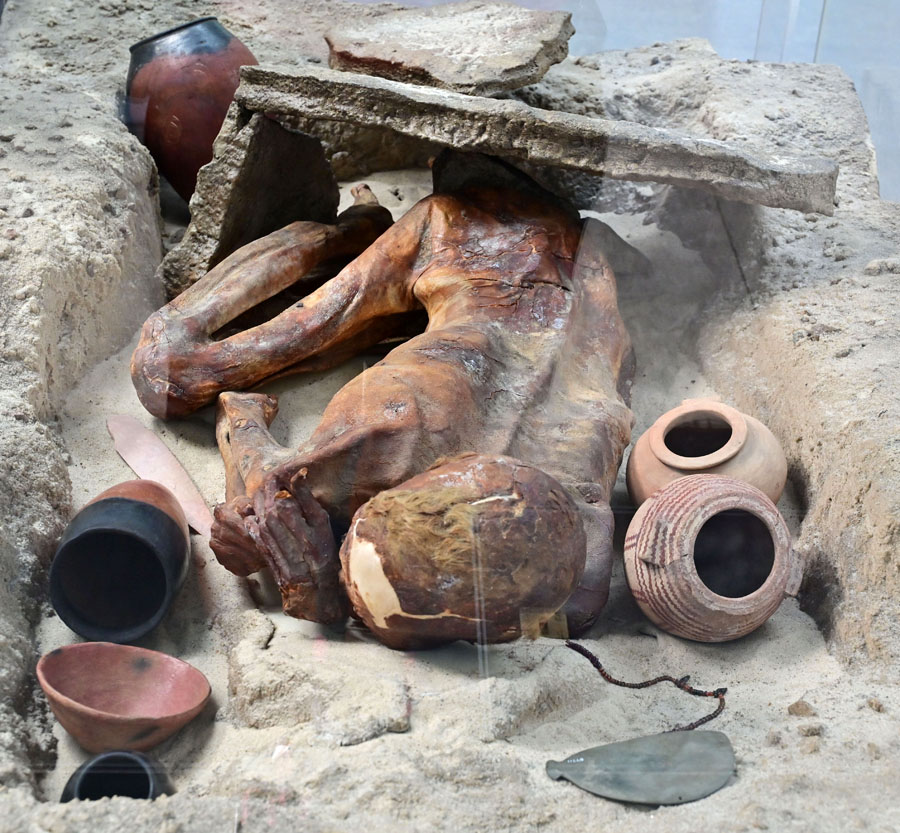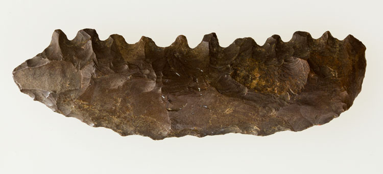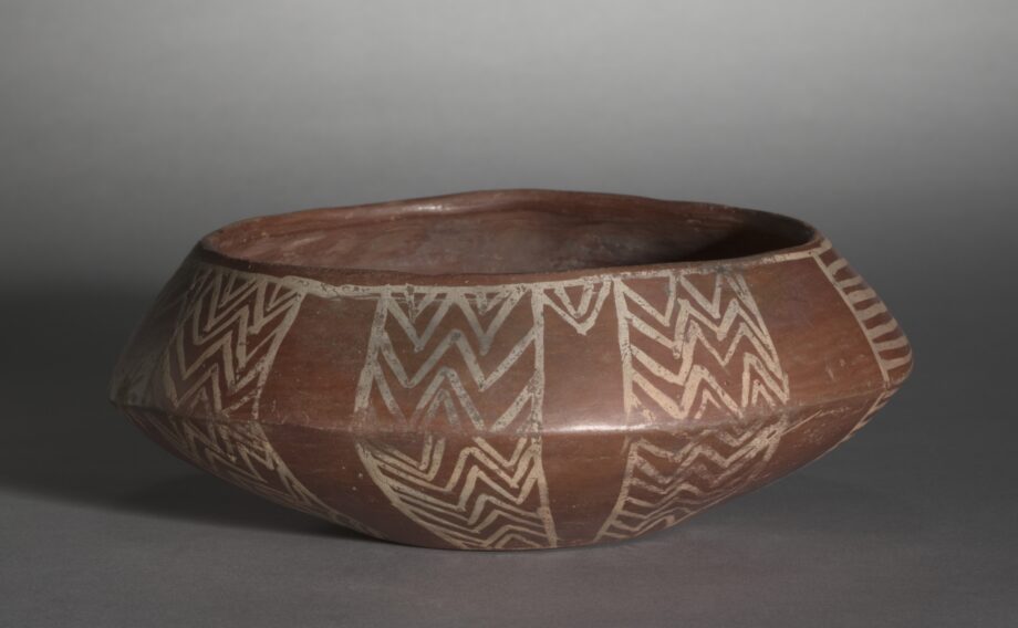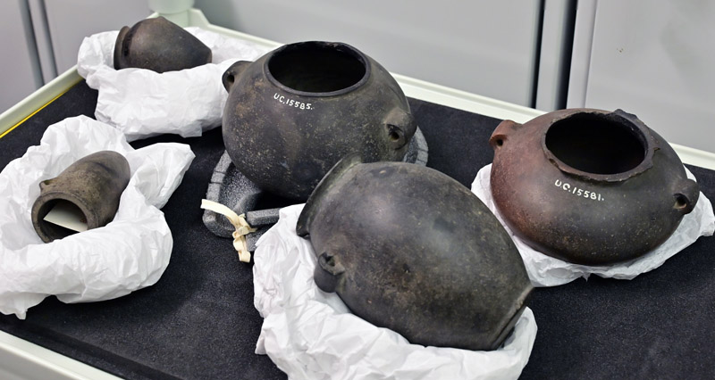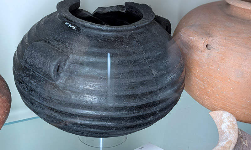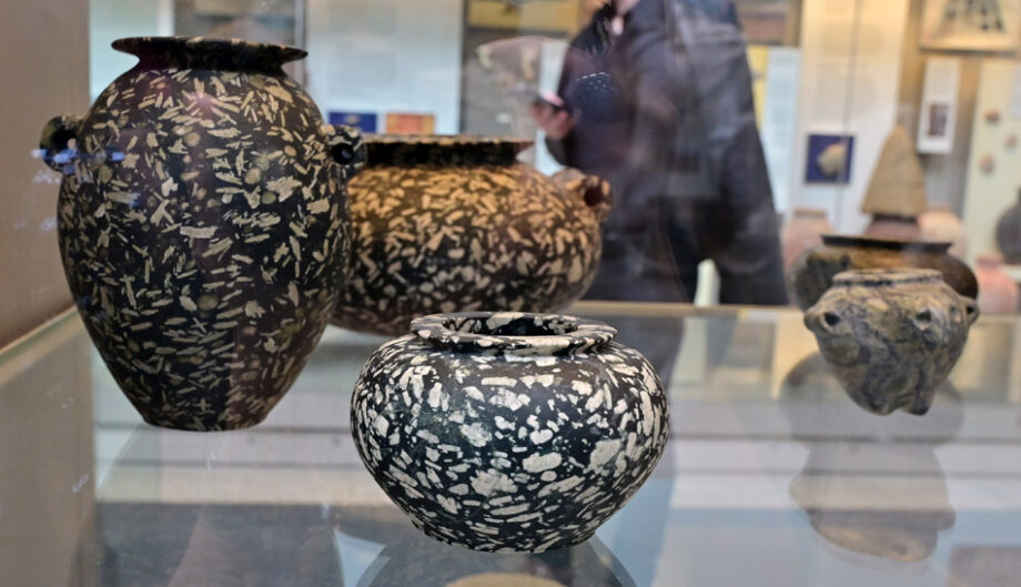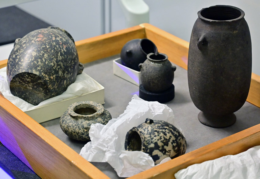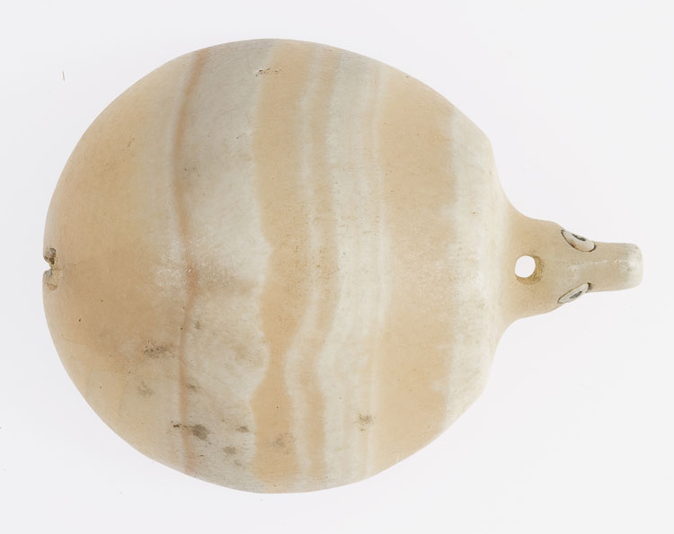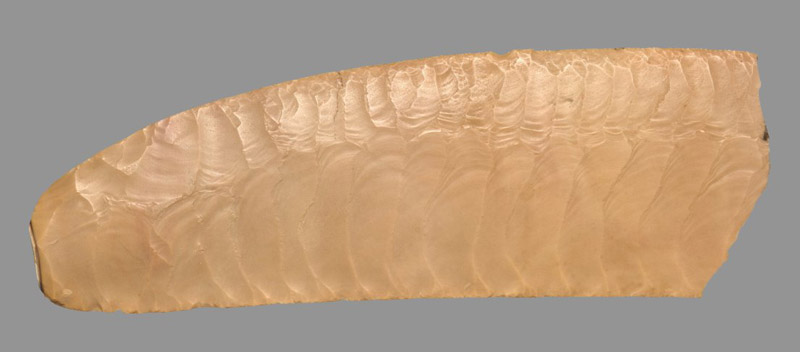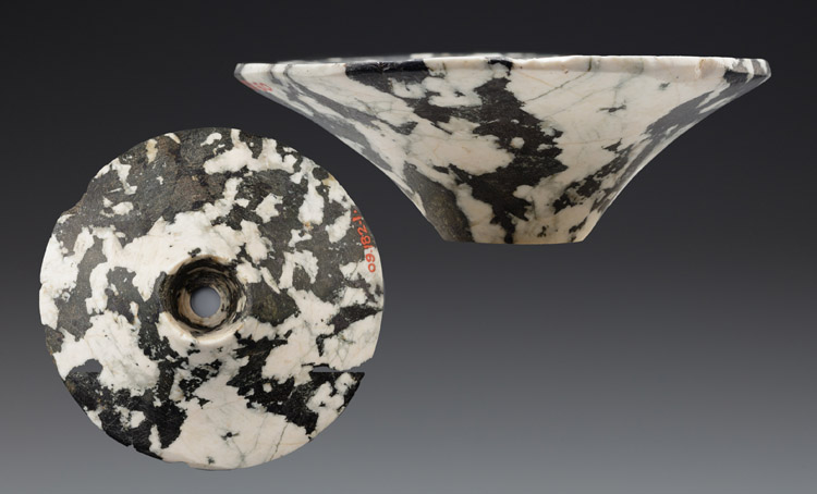 Calcite is a soft rock that’s either colorless or white with unique rhombohedral cleavage. Because of its easy breakage it was used in beads production, not the vessel manufacturing.