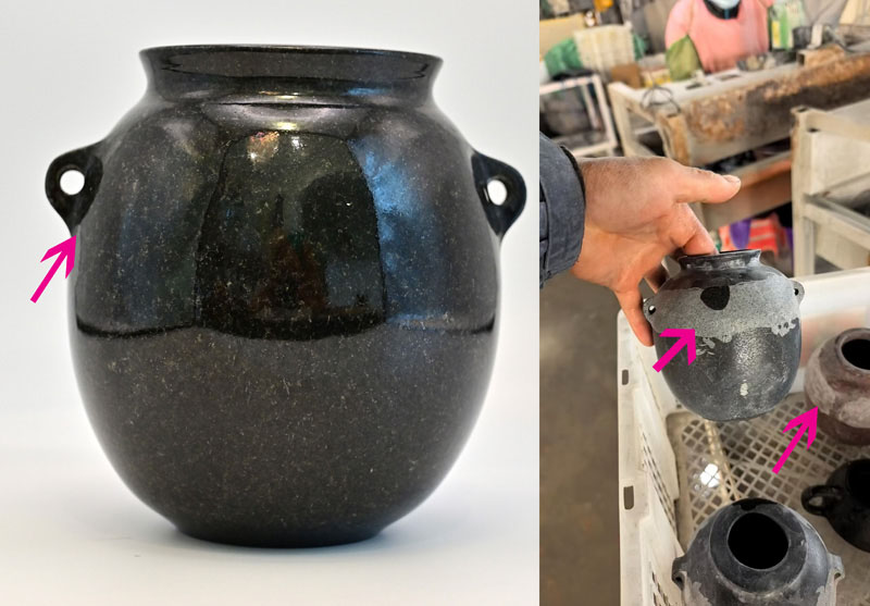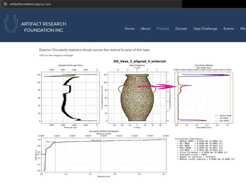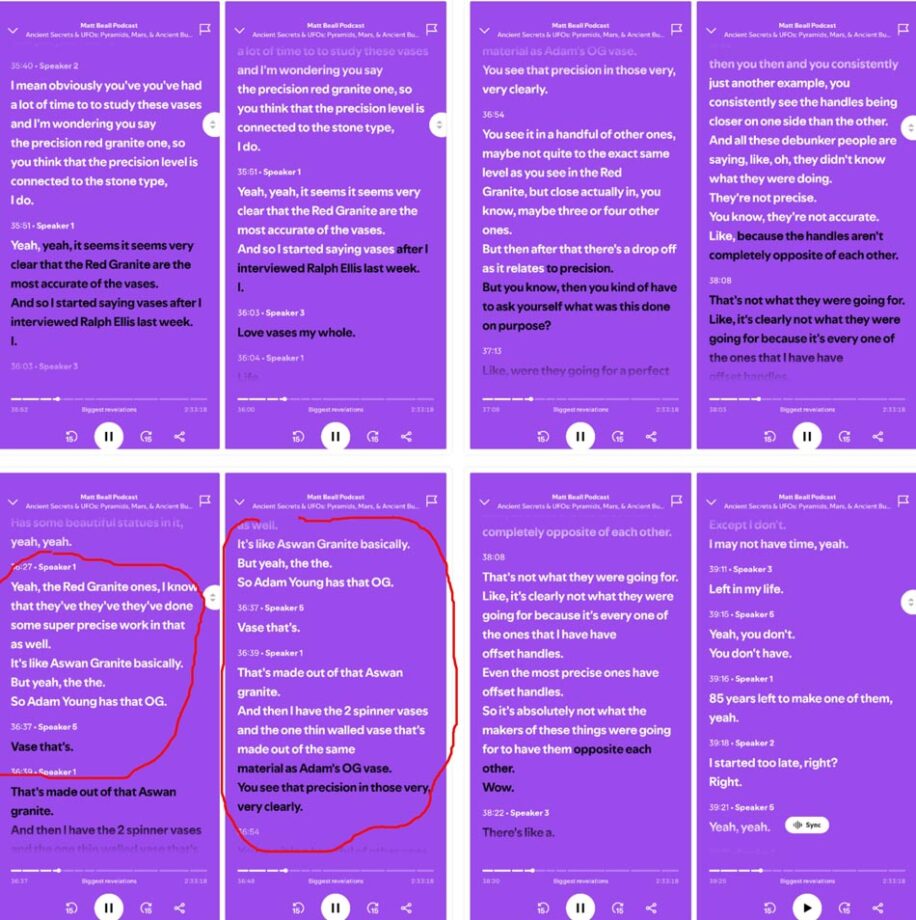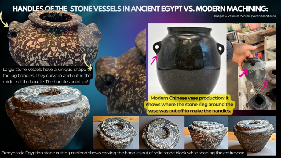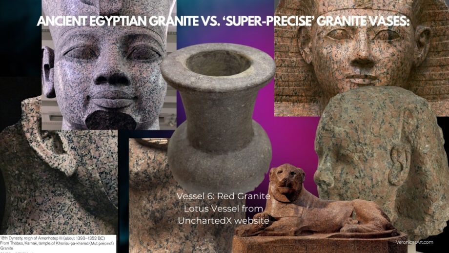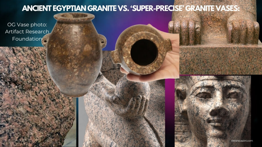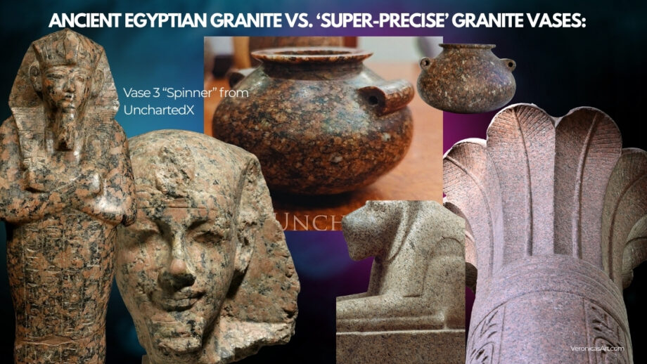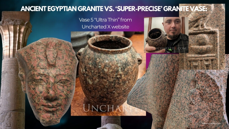 This means that the “super-precise” stone vases made of granite are modern machine-made examples with high probability. They don’t come from the predynastic Egypt, and perhaps these vases were created as artful objects in other time periods (the late 19th-early 20th century?) The pattern of real Egyptian Aswan red granite is visually different from all precise granite vases shown in a file titled “2023 Danville Metal Stamping Vase Metrology Report” (under Vase Scan Resources Tab) on Uncharted X website.