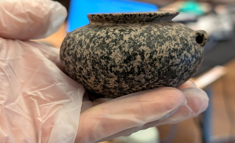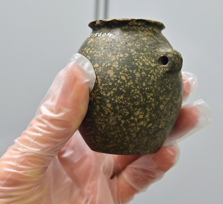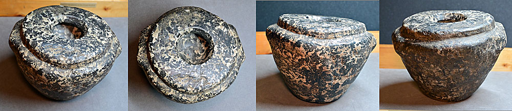 Steatite is a super soft, mineral talc of greenish grey, brown or grey colors rarely used in stone vessels. It is extremely soft and was labeled as soapstone. Steatite used to be mixed up with limestones, serpentine and siltstone in museums’ labeling of stones.