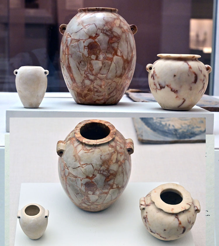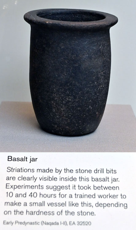 According to statistics compiled by Lucas, travertine was the third most commonly used stone for vessels in the Predynastic Period, surpassed in quantity only by limestone and basalt. In all subsequent periods of Egyptian history, travertine was by far the most common material for stone vessels.p.47
