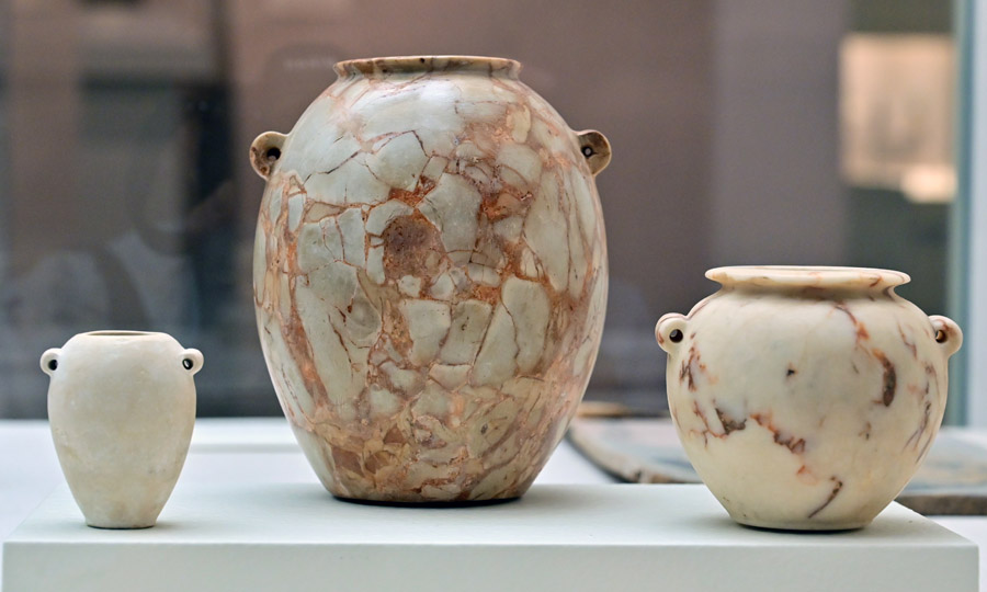 Travertine is also a soft but compact rock of varied colors- white, yellow, brown, yellow-white. It was widely used in the predynastic Egypt and remained the most popular rock used for stone vases in the entire Egyptian history! In Egyptian sources, travertine was named alabaster and these words are interchangeable. Alabaster was the cheapest stone used for vessels in Egypt. Greek traveler, Pliny recorded ‘alabaster’ or ‘Alabastron’ as the town’s name where the stone was sourced. Used in the Old Kingdom, Travertine is different from alabaster in chemical composition and origin.