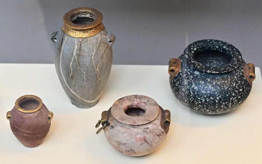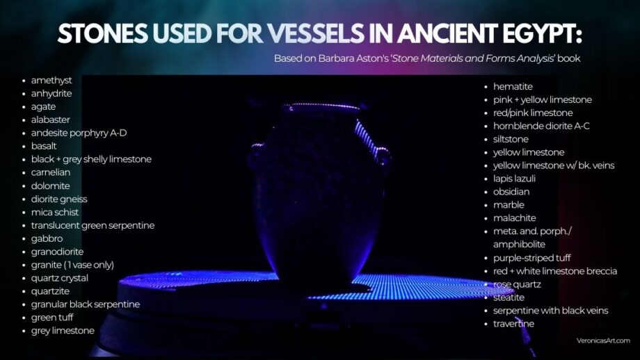 Rose quartz has a pink coloration. Amethyst is translucent quartz crystal with purple hue (iron inclusions give the color). It was used in the Middle Kingdom for beads, amulets, and scarabs as well as Roman times. I haven’t seen a stone vessel made of amethyst in museums. There are a few documented amethyst vessels manufactured during Naqada III through Dynasty 2.