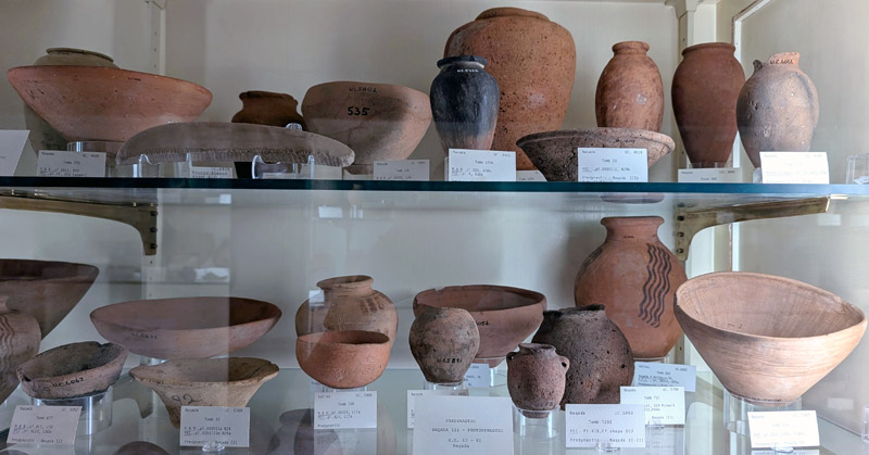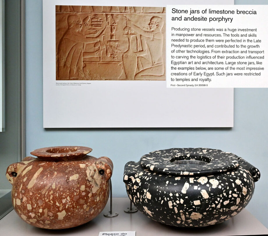 Red and white limestone breccia vessels are often on display in the museums as Egyptians used this stone heavily from Naqada I to the 4th Dynasty. This stone has a unique pattern of white limestone pieces set in a red rock of hematite and carbonate cement. White pieces vary in size and color.