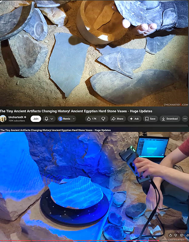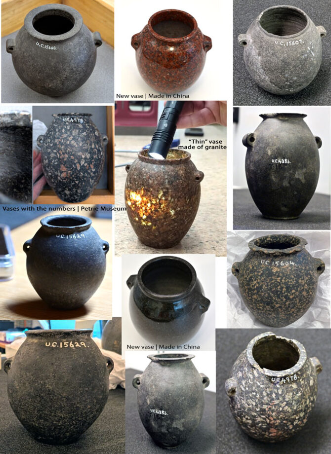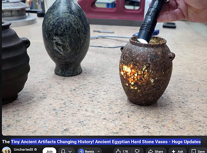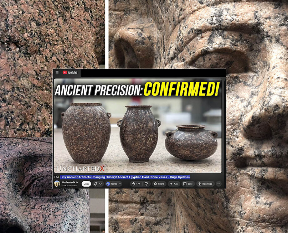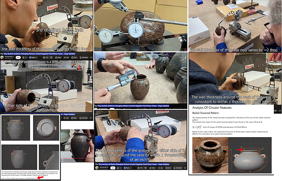 This means that the “super-precise” stone vases made of granite are modern machine-made examples with high probability. They don’t come from the predynastic Egypt, and perhaps these vases were created as artful objects in other time periods (the late 19th-early 20th century?) The pattern of real Egyptian Aswan red granite is visually different from all precise granite vases shown in a file titled “2023 Danville Metal Stamping Vase Metrology Report” (under Vase Scan Resources Tab) on Uncharted X website.