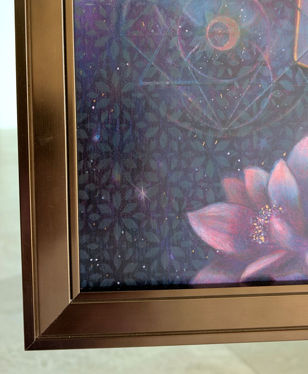 -Framed with a wood frame and UV-protective, non-glare plexiglass.